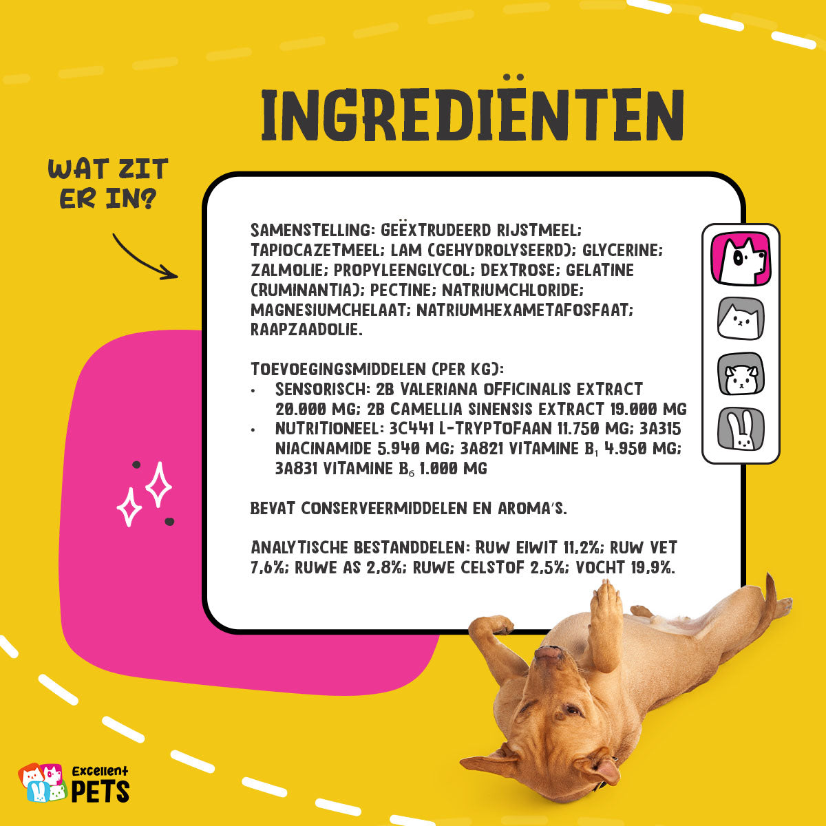 Excellent Pets No Stress Soft Chews bevat onder andere L-tryptofaan, valeriaan, groene thee en magnesium. L-tryptofaan is een essentieel aminozuur, dat bijdraagt aan de productie van serotonine, een stof die zorgt voor een gevoel van rust en welzijn. Daardoor worden honden rustiger in stressvolle situaties. Magnesium heeft een gunstig effect op het zenuwstelsel en de spieren en het stimuleert ontspanning. Valeriaan heeft een rustgevend effect en is ideaal bij spanning of in stresssituaties. Groene thee is rijk aan antioxidanten, die helpen het lichaam te beschermen tegen schadelijke invloeden.