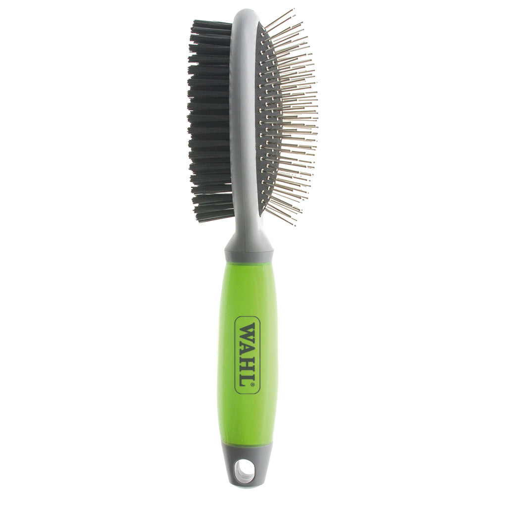 - 2 in 1 borstel met roestvrijstalen pinnen aan de ene zijde voor het verwijderen van losse haren en kunststof borstelharen aan de andere zijde voor een glanzende vacht